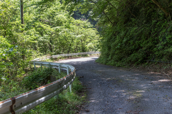そんな立派な現橋を左手に見やりつつ先へ進むと、道はややきつめのカーブを描いており、ガードレールの向こう側を直線状に進んだ先に、道の跡が続いています。