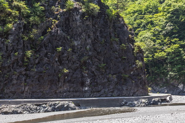 先に種明かしをする格好になってしまいますが、対岸の途轍もない岩壁の下にあるコンクリートの塊は、あくまで護岸ではなく旧県道の廃道区間です。川面までの高さは3mもないでしょう。