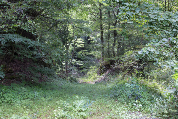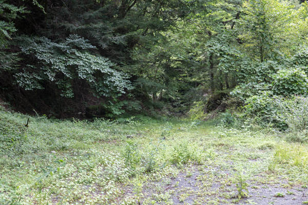 浦の沢隧道からここまでの区間は上村川と道の間に植生があり日陰となっていたので道がよく残っていましたが、上村川と直に接して陽光が当る区間に入った途端、路盤が緑に脅かされ始めます。