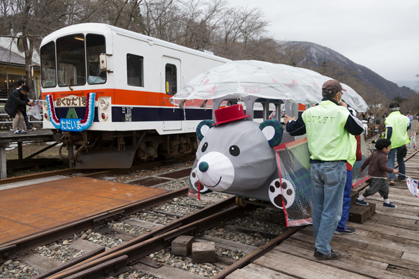 子供向けには熊を模した「くまとろ」号も。こどもたちを載せて構内を往復。