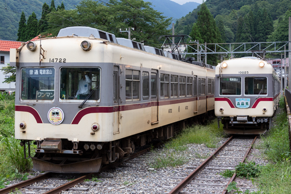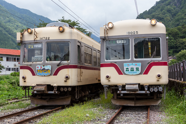 最初は10025号がやや立山駅寄りに停車していたので、14722号の側面をとらえつつ10025号を撮影。