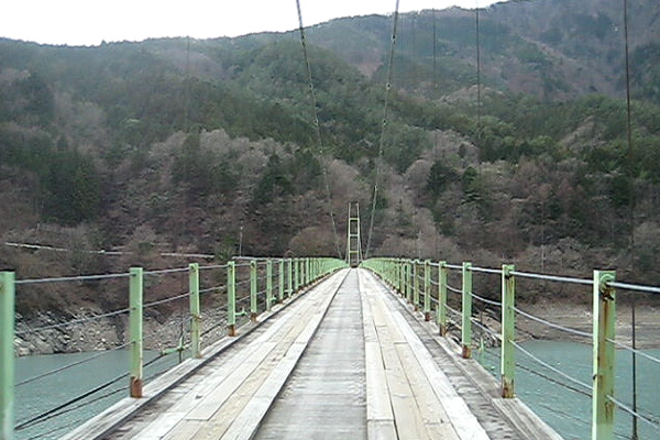 県道から橋を眺めます。車両の通行が可能とはいえ、やはり広い湖面に渡された吊橋は少し華奢な印象を見るものに与えます。