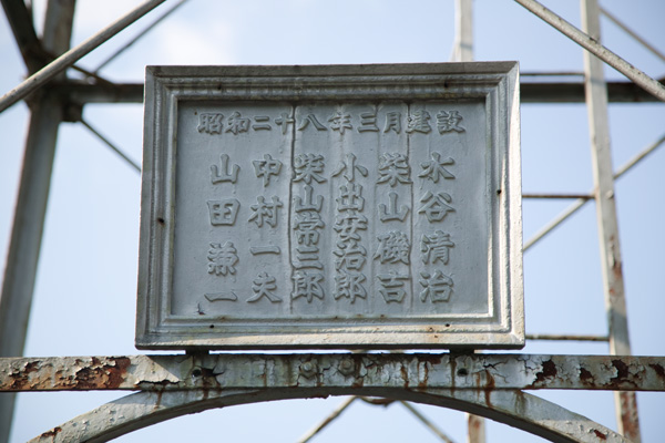 集落の中に立つ櫓。見張台には鳥が巣をかけている。非常に背が高く、三段で折り返す梯子の上方折り返し部分に片側だけ張り出した踊り場があり、半鐘はそこに吊るされている。 基部には、建設を記念した鋳造の額のような形状の銘板が掲げられている。