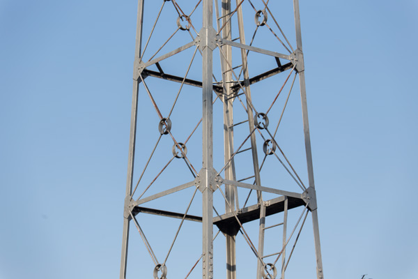 梯子は二段で桁内設置。踊り場は張り出しのない簡易なもの。上一節目の水平材部分にも梯子の幅の分だけ小さな足場が用意されている。