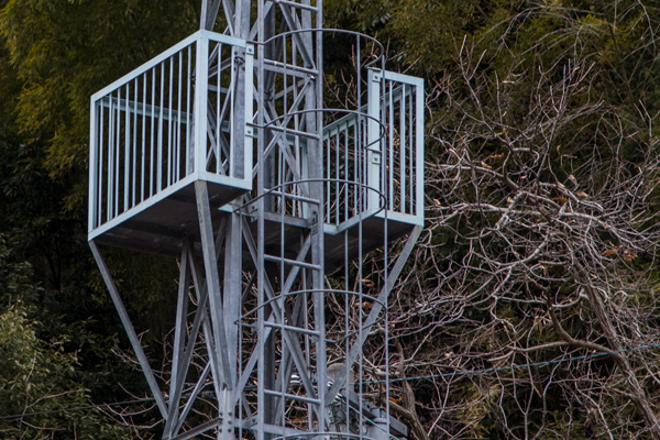 国道153号から一本外れた市道沿いに立つ櫓。浅めの四角屋根に四角形の見張台。屋根下にはホース干し用の太い竿が大きく張り出している。 部材はすべて等辺山形鋼のボルト締結で、比較的新しい年代の建造とみられる。 梯子は一段で桁外設置。転落防止柵が設けられている。