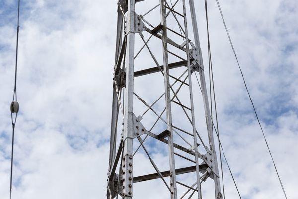 脚は三本で、主材、水平材が等辺山形鋼製、斜材は丸鋼をX字状に組み、張力調整用の枠式ターンバックルを組み込んだもの。各節の接合はプレートにより、主材とは溶接、水平材とは六角ボルト、斜材は丸鋼端部に平板を溶接したものを六角ボルトで締結している。