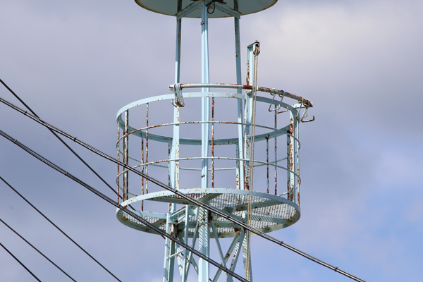 見張台は円形で、手摺は等辺山形鋼、水平材は丸鋼を用いている。垂直材は等辺山形鋼と丸鋼を交互に配置している。手摺の一端にはホース昇降用の滑車が設けられ、ホース干し用の竿が手摺に沿ってカーブを描いて設けられている。