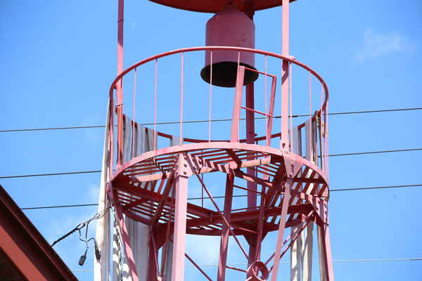 大鰐から黒石へと抜ける国道454号沿いに建つ櫓。見張台の屋根は円錐形で、頂部には避雷針があるが先端はT字型になっており、水平部の用途は位置関係から照合しても特に方位を示すようなものでもなく、風向計としては鏃と羽根がなく風を受ける構造になっておらず用途は不明。見張台は円形で、手摺部は太めの、垂直材は細めの丸鋼製造。