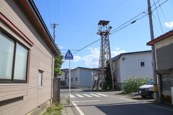 弘南鉄道大鰐線鯖石駅から東へ進み平川を渡った対岸にある森山集落の中心部の町道T字路に建つ櫓。屋根は浅めの四角形で、頂点部はじめ特に避雷針や風向計、蕨手などの装飾物は一切見られない。裏を見ると野地板と垂木には木が用いられている。