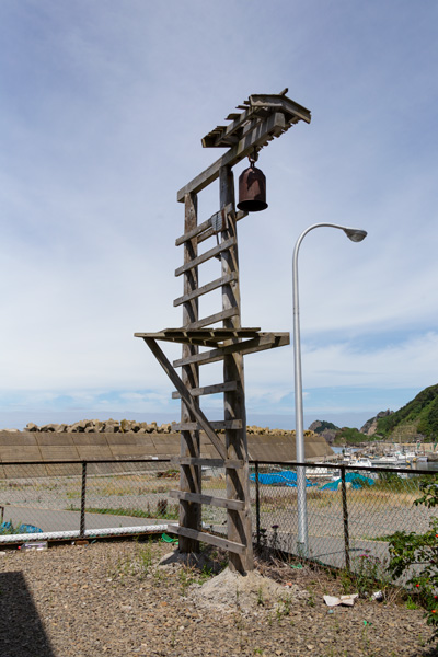 斧のような形状をした下北半島の、斧の刃先にあたる津軽湾口にある磯谷地区、国道338号から港へ向かう道の分岐点にある磯谷地区漁民研修センターの敷地内に建つ火の見梯子。海岸沿いであり塩害を避けるためか木造となっている。