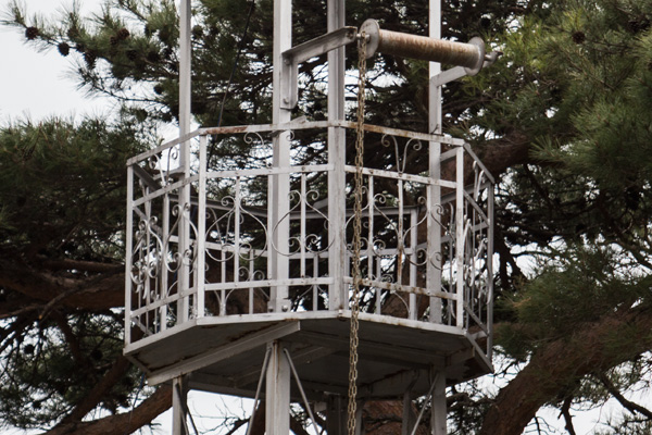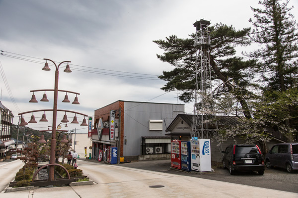 岳温泉の温泉街奥部に立つ櫓。八角形の屋根は頂部が円筒形になっており、屋根飾りは蕨手以外には見られない。 半鐘は屋根下中央部ではなく軒下に吊るされている。見張台鴨居部分はアーチ上の造形。 梯子は二段で上段が桁内、下段が桁外。踊り場の出入口部分の鴨居には唐草状の装飾が施されている。