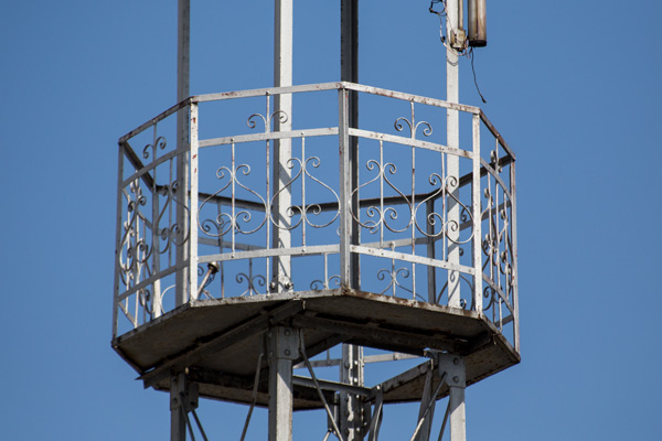 国道4号を一本南に外れた新白河駅近くに立つ櫓。カールの多い蕨手がついた八角屋根には、避雷針、風向計、屋根飾りが取り付けられている。見張台の欄間、欄干、踊り場には唐草風の装飾が施されている。また、下段踊り場の出入口梁部にも唐草風の装飾が見られる。 梯子は三段で、最下段のみ桁外設置。上段の踊り場には、欄干から張り出すように蕨手状の装飾が突き出しているのが特徴的。