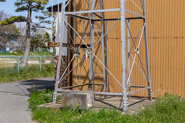基部は梯子の出入り部分のみゲート状に等辺山形鋼製の垂直材が設けられ、主材との間にはトラス状に補剛が入れられている。基礎の上部には水平材が渡されており、櫓本体はその直下で基礎に埋設されたベースプレートにボルト締結で固定されている。