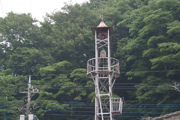 「峠の釜めし」で有名な、信越本線横川駅前にある櫓。梯子は2段で下段は垂直、上段は傾斜がついている。 半鐘は文様のある古いタイプ。屋根下の×状の桁組みがちょっとしたアクセントになっている。