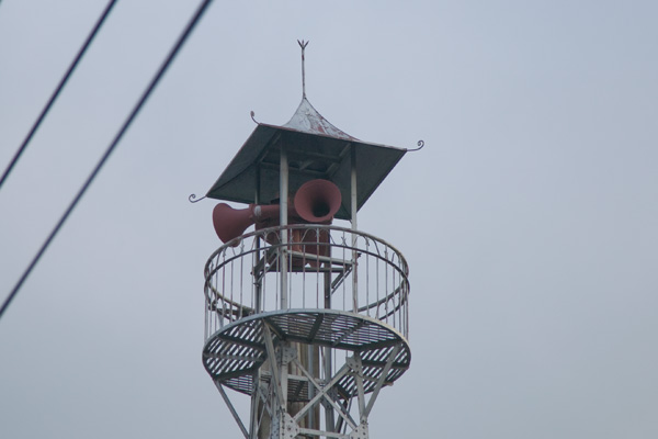 田代の町の中心部に立つ櫓。梯子は三段で、上の段に片側だけ張り出した踊り場がある。 踊り場には半鐘が下げられている。基部には信号表が掲示されている。