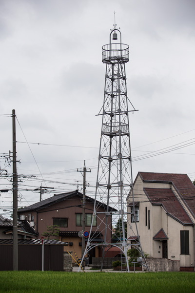 住宅と田圃が同居する住宅地に立つ櫓。比較的高層で、円形の見張台には屋根がなく、アーチ状の柱に避雷針と唐草状の装飾が設けられ、その下に半鐘が吊るされている。 主材(脚)は高層であることからか、かなり裾広がりになっており、基部は送電鉄塔のように逆T字型に持ち上げられている。 梯子は二段で上下とも桁内設置。中間に張り出しの無い踊り場が設けられており、ホース干し器具も用意されている。