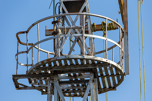 見張台は円形で、高欄は手摺が太目の鋼管、垂直材が細めの鋼管、水平材が平鋼、下部外縁が等辺山形鋼製。床版は平鋼を簀の子状に並べたもの。高欄には、T字型のバーが二か所に取り付けられ、それぞれにホース昇降用の滑車が吊るされている。また、梯子の出入口部分はコの字型に外側へ張り出している。