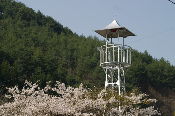 田沢温泉の入口に立つ櫓。山間の傾斜地で眺望が良く利く立地。