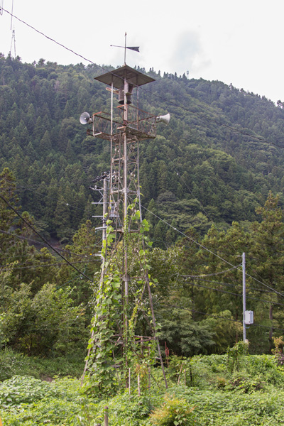 国道152号沿いにある大島集会所前の坂道を登ってすぐのところに建つ櫓。屋根は反りのついた四角形で、頂点部には先端が鏃形の避雷針と風向計が設けられている。見張台は四角形で梯子の出入口部分は切り欠きが入っている。外縁は等辺山形鋼製、垂直材と斜材は丸鋼製で水平材は見られず|X|状の造形となっている。 脚は四本で主材、水平材は等辺山形鋼製、斜材は丸鋼をリング状のバックルで結合したもの。各節はプレートでボルト締結されている。 梯子は一段で、桁外に設置されている。