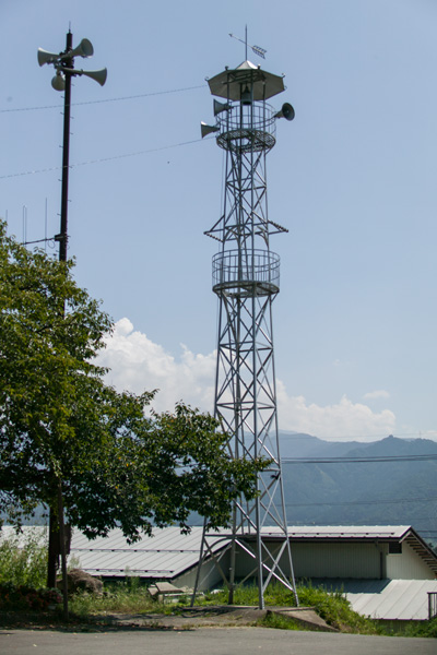 高台にある公会堂の敷地内に建つ櫓。風向計の矢尻が切り抜きかれていることと、幅の広い蕨手が特徴的。 いたずら防止のためか、梯子は下二節目から設けられている。基部には銘板が取り付けられているがペンキが重ね塗りされており、かすかに「須坂鐵工所」と判読できるのみ。