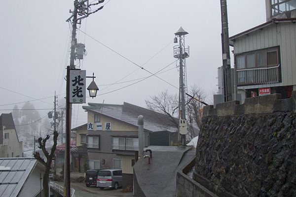 急傾斜地の途中に立つ櫓。下の集落を広く見渡すことができる。 小柄で桁間も狭く、梯子は外付け。見張台部分の桁が狭いため、半鐘は屋根中央ではなく軒先に吊り下げられている。