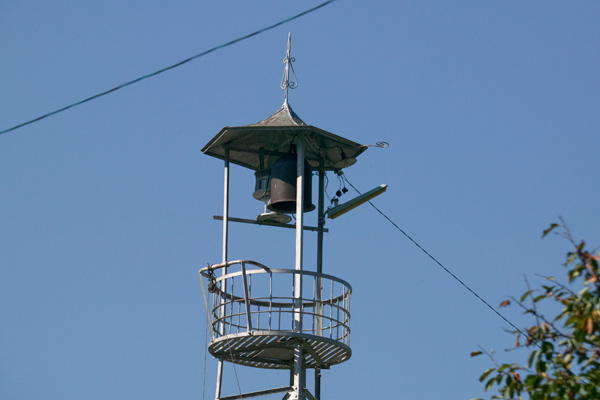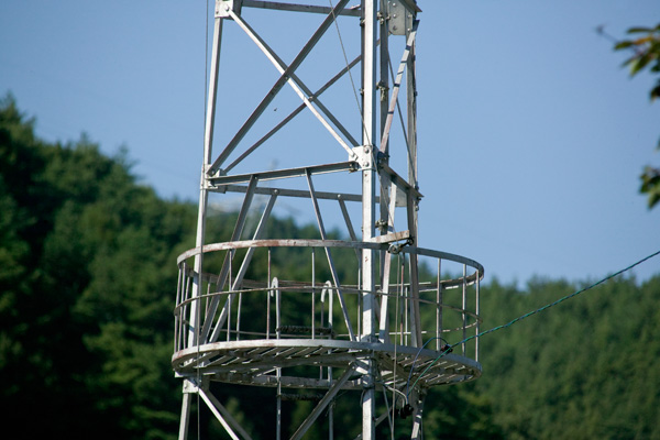 集落の中心部に立つ櫓。反りのついた六角屋根は、頭頂部に屋根飾りが設けられているほか、軒先に一箇所、この辺りの櫓によく見られる謎の蕨手状の金具が水平に取り付けられている。 梯子は二段で、中間に円形に張り出した踊り場がある。斜材は踊り場より下側二節が丸鋼にリング式、上側二節が等辺山形鋼のボルト締結。 基礎は梯子の部分だけ嵩上げされたようになっている。