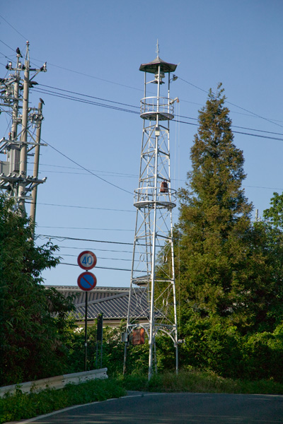 県道沿いに立つ櫓。六角屋根、三本脚で比較的背が高く、形状は岩垂第三農事組合生活改善センターの櫓に類似しており、中間に円形の踊り場が設けられている。 基部には錆びてしまいほとんど文字が判読できないが消防信号表が掲示されている。