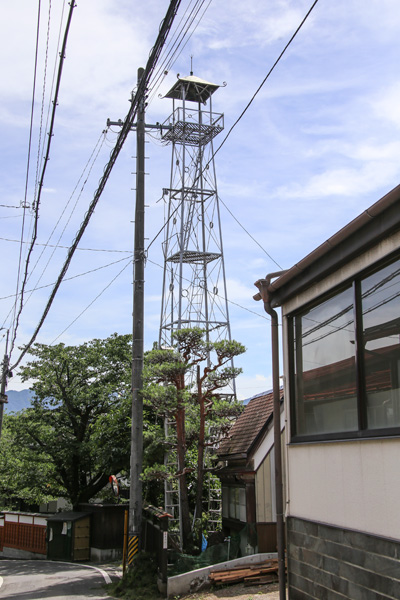 脚は四本で、主材、水平材が等辺山形鋼製、斜材は丸鋼とリング式張力装置の組み合わせ。梯子は三段で、中間には張り出しのない踊り場が設けられており、上段の踊り場にはホース昇降用の滑車が、下段の踊り場には半鐘が設置されている。