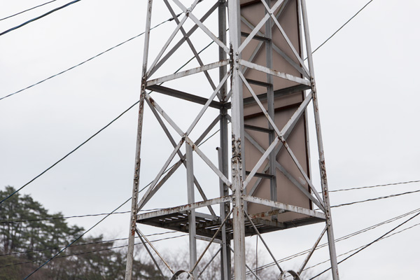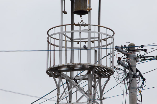 鹿教湯温泉の入口に立つ櫓。四角形の屋根は頂部に避雷針とくの字形の屋根飾り、蕨手が設けられている。半鐘の横には打鐘用の撞木が吊るされている。 見張台は円形で手摺部分が太目の丸鋼、垂直材部は細めの丸鋼で、手摺のやや下部に平鋼の水平材が渡されている。 斜材は下二節がリング状のバックル、上四節が平形鋼ボルト留めとなっている。側面には防災標語が掲示されている。
