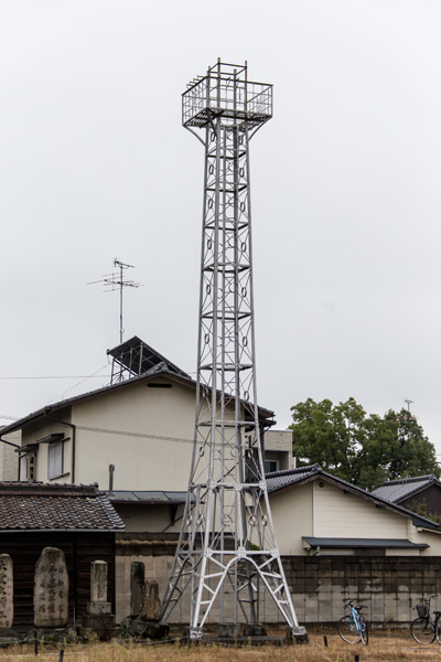 JR山陽本線、庭瀬駅の北東に建つ櫓。屋根はないが見張台に柱らしいものが見られるため、老朽化などで撤去されたものと思われる。