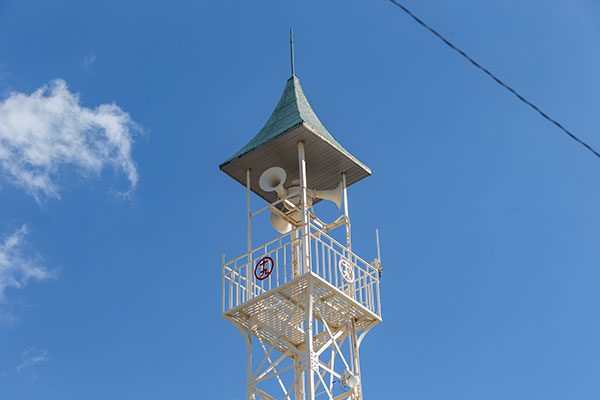 見張台高欄は手摺、水平材、斜材のいずれも鋼管製で、四隅の柱頭には球形の造作がなされている。また、十九分団を示す〇に十九の切り抜き文字が四方の高欄中ほどに掲げられている。