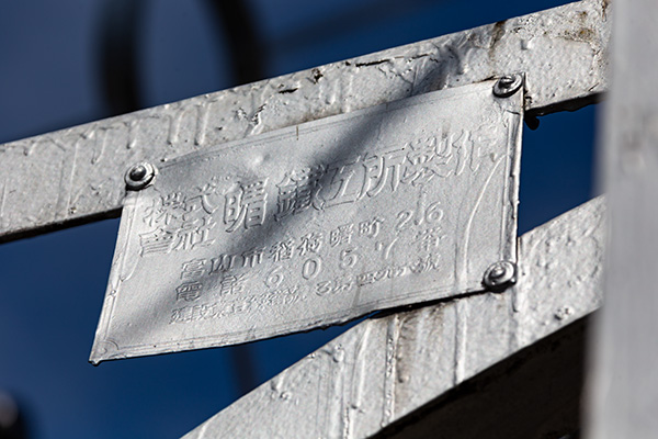 基部はベースプレートで基礎に固定されており、アーチ状の方杖が入れられている。方杖のアーチ天端脇には、「株式會社曙鐵工所製作 富山市稲荷曙町26 電話6057番 建設業登録番號3第四九六號」と記された製造銘板が掲示されている。