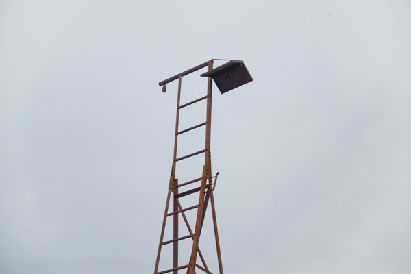 脚立型ような形状の櫓。正面の横桁は梯子状に組まれており、それ以外はX字状のブレースとなっている。 半鐘用の小屋根は上部に掛けられているが、半鐘自体は下部に吊るされている。