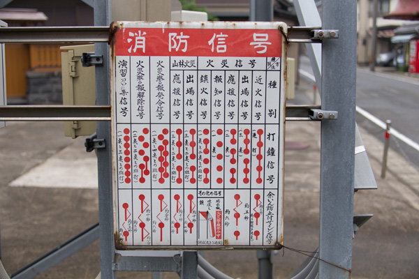 吹浦の街中、大物忌神社の参道前に立つ櫓。屋根は単に構体の上に板を載せただけのもので、四方へ向けてスピーカーが取り付けられている。 斜材は等辺山形鋼をくの字状に渡している。梯子は一段で外付け。上層部にはサイレンとスピーカーがありスペースが取れないからか、半鐘は最下段に吊るされている。 半鐘の傍らに消防信号表が掲示されている。