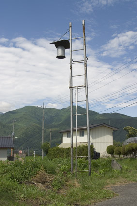 梯子型の脚を刺又状の鋼管の支柱で支える櫓。半鐘の部分には屋根が取り付けられている。