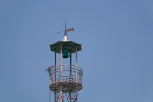 神社、公民館のある集落の中心に建つやぐら。8角屋根の上には大柄な風向計が載せられている。