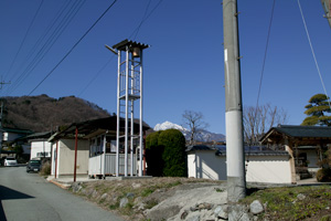 円野町の火の見とほぼ同型の鋼管で組まれたやぐら。各部材、半鐘ともに光沢があり、近年建造されたばかりと思われる。 デザイン的には実用一辺倒であまり面白みが無い。見張台には撞木が取り付けられている。