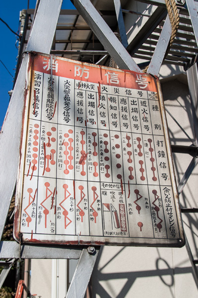 災害時に半鐘を鳴らす方法には決まりがあり、消防法施行規則によって打鐘方法が規定されている。火の見櫓にはそれを一覧表にした信号表が取り付けられている事が多い。